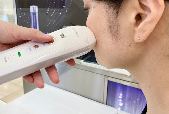 夏は紫外線やエアコンの影響で1番お肌へのダメージが大きいと言われています。その夏を超えた今のお肌の状態をエピステームではチェックすることができます。エピステームの肌チェックは、店舗で肌測定器を使った肌チェック、オンラインではWEB上での簡単スキンチェックプログラムの2つありますが、今回は店舗での肌チェックをご紹介します。店舗での肌測定機はメイクをしたまま頬の部分を測定します。