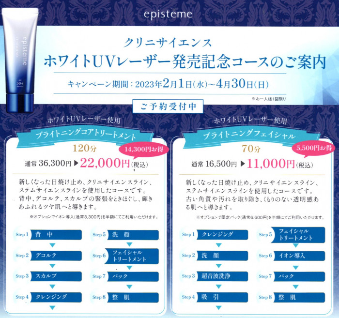 こちらは3月1日に新発売した日焼け止めクリーム「ホワイトUVレーザー」もお試しいただけるメニューとなります。