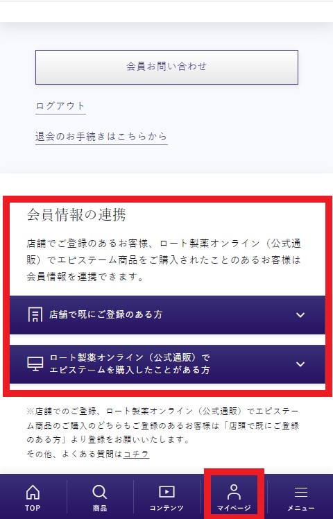 店舗でご登録の会員情報とロート製薬オンライン (公式通販)での会員情報については新規登録の際に「店舗で既にご登録のある方」もしくはマイページへのログイン後に「会員情報の連携」で連携いただく事で会員情報が連携できます。