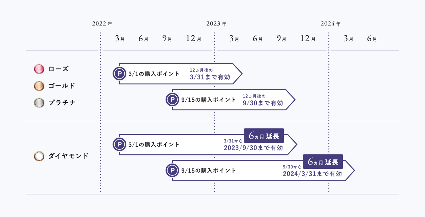 ダイヤモンドメンバーのお客さまに限り、翌年度のステージ確定時に保有ポイントの有効期限が半年年延長され、ご購入日から1年半となります。