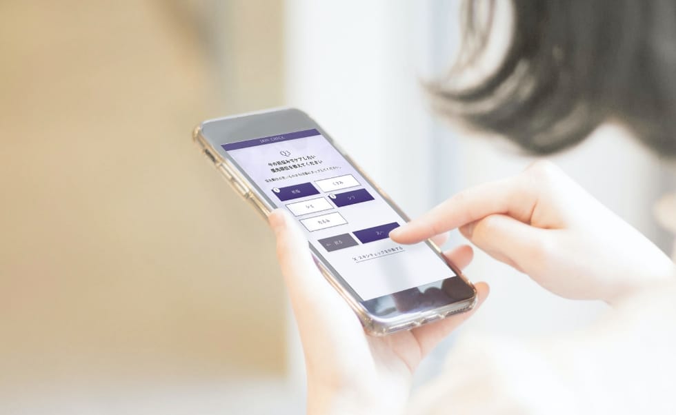 肌悩み・肌状態・生活習慣などの質問があります。当てはまる項目を選んでください。鏡でご自身の肌状態を確認しながらチェックいただくのがおすすめです。目元専用のチェックページもございます。