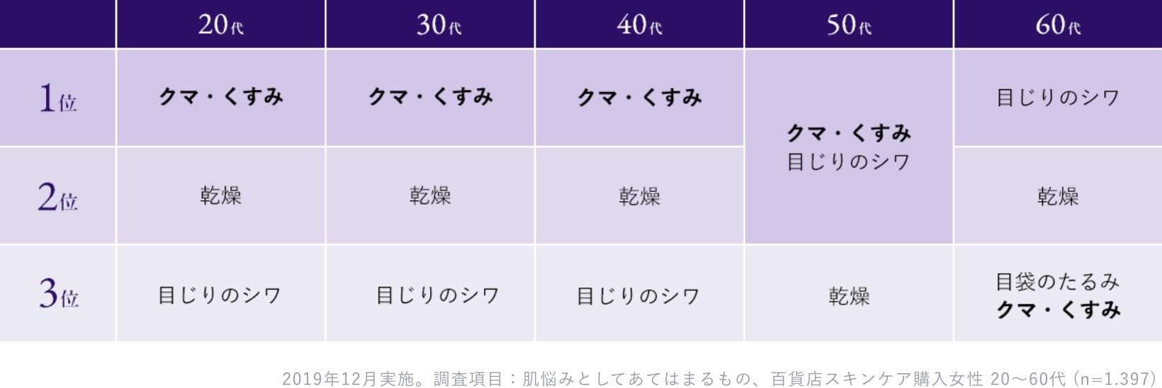 私たちが実施した調査ではどの年代でも目元悩みの上位に「クマ・くすみ」が上がりました。