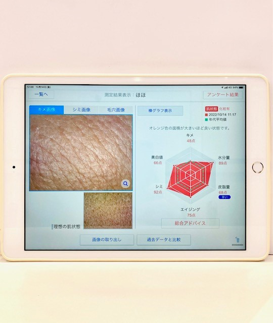 測定時間は5分程度で、測定できるのはキメ、水分量、皮脂量、エイジング、シミ、美白値の6つの項目です。6つの項目の結果がグラフでipadに表示され、同年代の方の平均値と比較することができます。また画像では、キメ、シミ、毛穴の状態が拡大されているのでより詳しく知ることができます。測定の結果はお客様とご一緒に確認し、結果をもとに今のお肌に必要な生活、お手入れのアドバイスや最適なスキンケアアイテムのご提案をいたします。