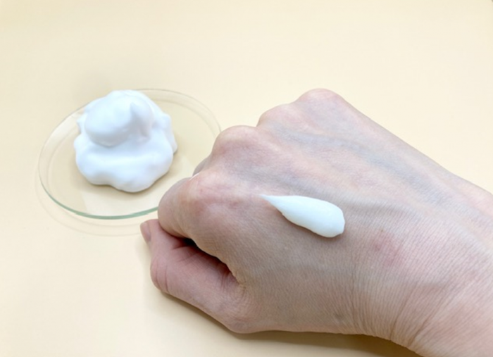 クレンジングはクリームタイプのクレンジングで、コクがありながらも肌に吸い付くテクスチャーが特徴で、メイク汚れや皮脂などをしっかり落とします。メイクとなじむと「フッ」と軽くなるのが、洗い流しのサインです。しっとりと素肌を洗い上げ、お肌の柔らかさを感じます。
